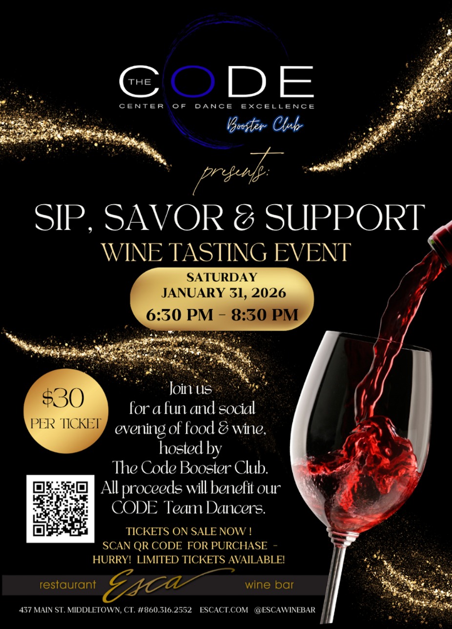 Join us on the 31st for a social evening with food & wine. This event will be hosted by Code Booster Club. All proceeds will benefit our CODE Team Dancers!
