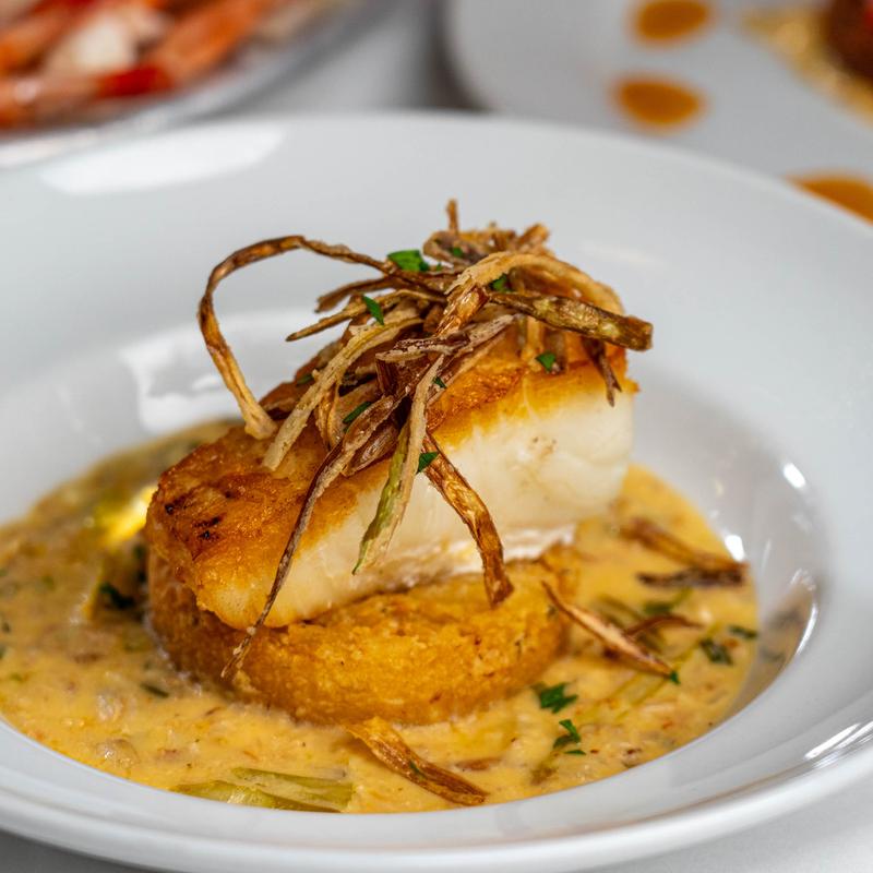 Crab, asparagus, crispy risotto cake, lemon & scallion crema.