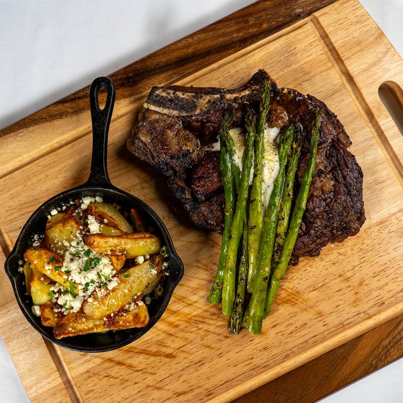 (C.A.B), roasted garlic compound butter, grilled asparagus, goat cheese, applewood bacon & herb roasted potatoes.