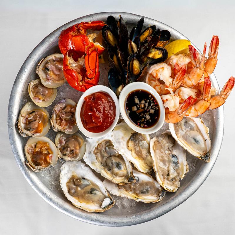6 shrimp, 6 clams, 6 oysters (chef's selection), chilled mussels, butter-poached lobster tail.