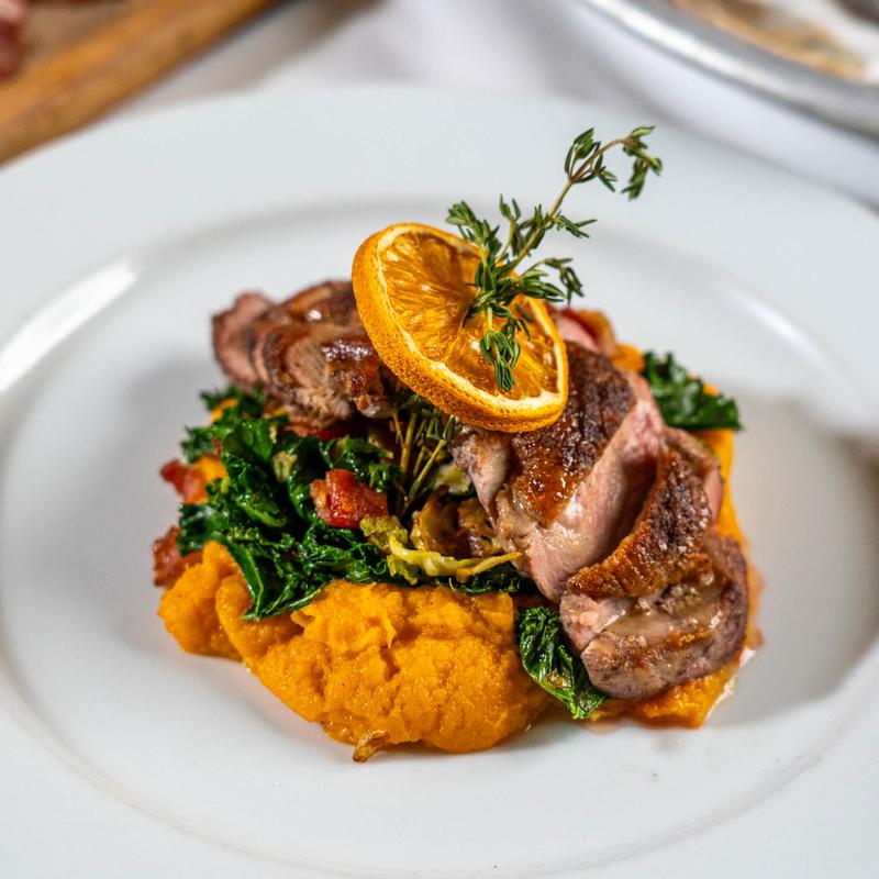 Italian plum sauce, sugar snap peas, duck fat mashed Yukon gold potatoes.