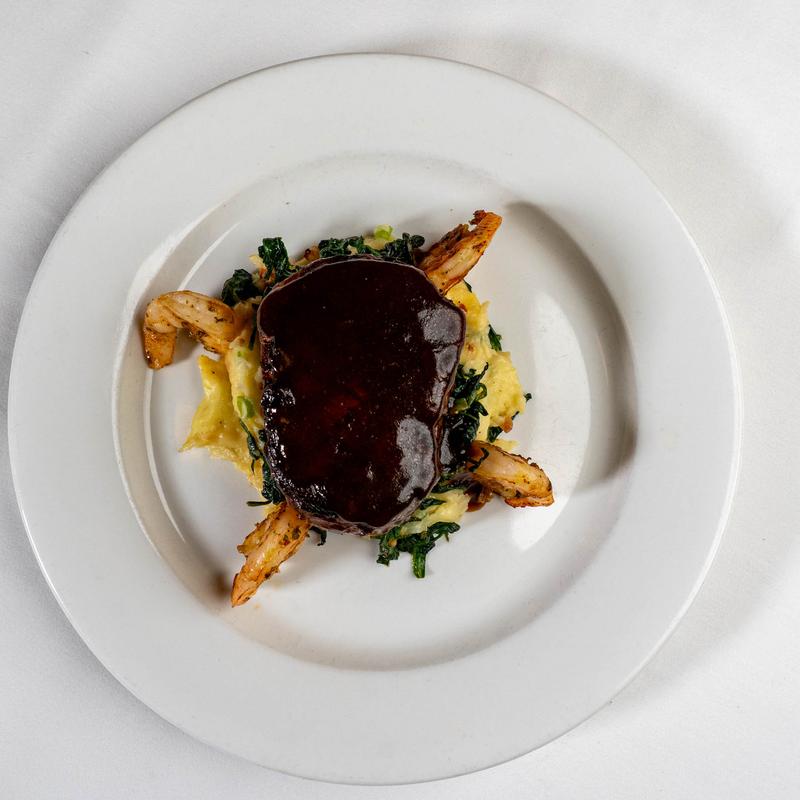 (8 oz C.A.B) filet mignon, grilled marinated shrimp, sautéed spinach, bacon & scallion mashed potatoes, Red wine demi.